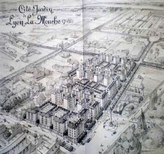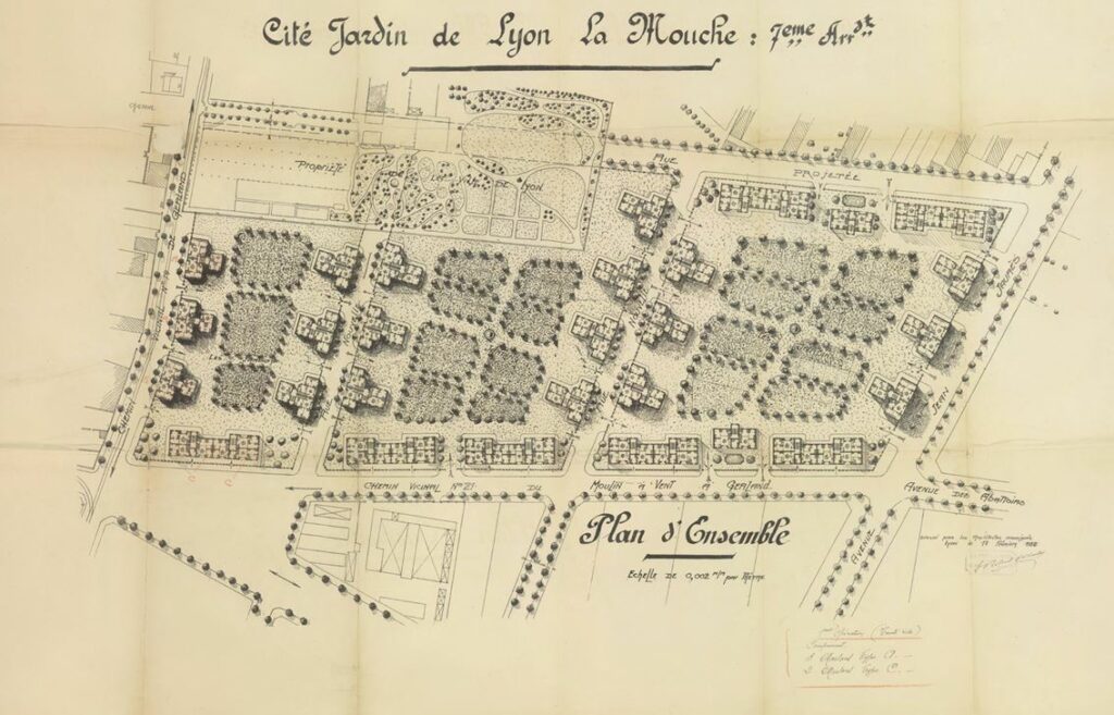 La Cité-Jardin de la Mouche élaboré entre 1924 et 1931 par les architectes Robert et Chollat est un site de grande ampleur visant à accompagner l’industrialisation de Gerland et son besoin de logements salubres. Cette évolution témoigne d’une réflexion nouvelle sur l’habitat et l’hygiénisme, en mettant en exergue une typologie novatrice : la cour ouverte, présentée par l’architecte Augustin REY au deuxième congrès de l’habitation, en mars 1920 à Lyon.
